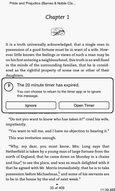 Originally designed for the Barnes & Noble Nook Touch e-reader, which lacks sound and vibrations, this application provides a countdown timer with pop-up notification messages and configurable onscreen clocks (see the bottom of the screenshots).