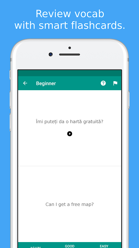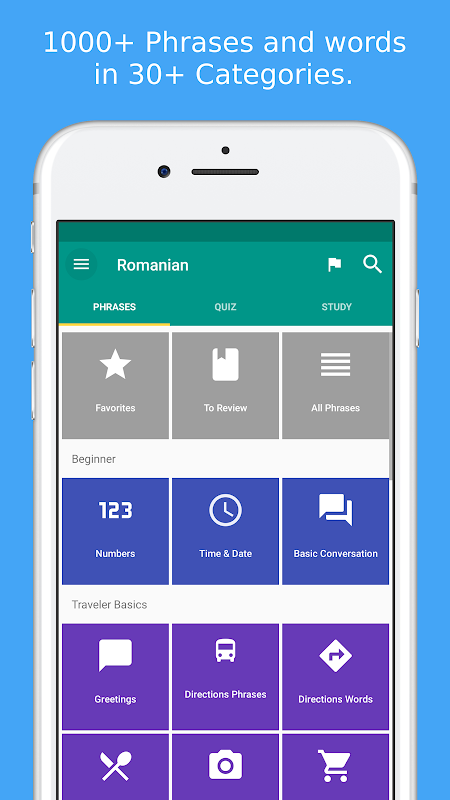 स्थान पुनरावृत्ति तकनीक का उपयोग कर फ्लैशकार्ड के साथ अपनी शब्दावली का अध्ययन करें। मजेदार रोमानियाई भाषा प्रश्नोत्तरी के साथ अपने ज्ञान का परीक्षण और अपने स्कोर की समीक्षा करें। ★★★ रोमानिया में यात्रा करते समय खुद को बचाएं ★★★ रोमानिया में जीवित रहने के लिए रोमानियाई वाक्यांश का प्रयोग करें। सभी महत्वपूर्ण वाक्यांशों शामिल किए गए हैं। उदाहरण के लिए, एप को रोमानिया में टैक्सी चालाक से बात करने दे ताकि वह उसे बता सके कि आपको कहाँ जाना है। आपको जो भी चाहिए उसके अनुसार सभी शब्दों और वाक्यांशों में खोजें । ★★★ मुख्य विशेषताएं ★★★