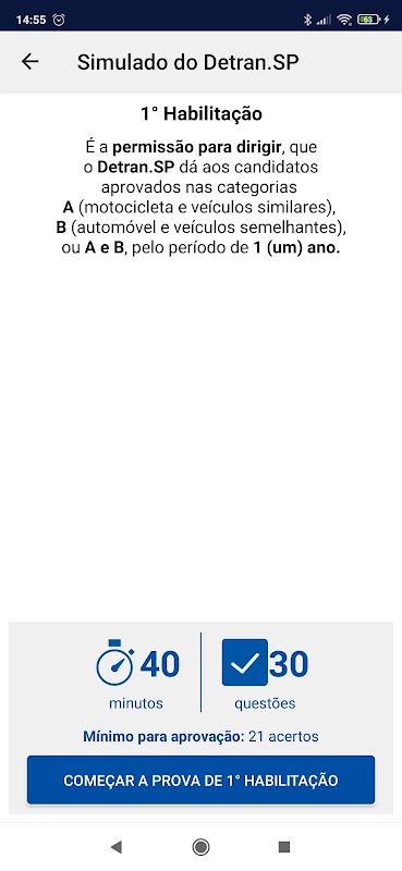 साओ पाओलो के राज्य में पहले लाइसेंस लेना होगा? नकली आधिकारिक ऑनलाइन Detran.SP साथ कक्षा अनुदेश के 45 घंटे में अध्ययन सामग्री पर अपने ज्ञान का परीक्षण करें. 40 मिनट में उत्तर दिया जा बेतरतीब ढंग से चयनित 30 एकाधिक पसंद सवालों, कर रहे हैं. अनुमोदन के लिए, आप सिद्धांत परीक्षण आज किया, बस के रूप में कम से कम 21 सवाल (70%) मिलनी चाहिए.
