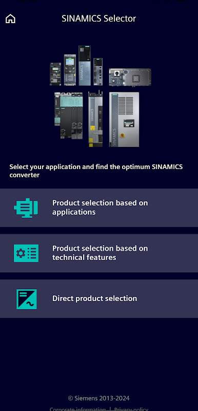 आप SINAMICS चयनकर्ता ऐप का उपयोग करके केवल कुछ चरणों में अपने SINAMICS कम-वोल्टेज कनवर्टर के लिए लेख संख्याएँ संकलित कर सकते हैं। 0.12 kW से 630 kW (0.167 hp से 700hp) की पावर रेंज में मानक फ़्रीक्वेंसी कन्वर्टर्स SINAMICS V20, G120C, G120P, G120X, G120 और G220, साथ ही हमारे सर्वो ड्राइव सिस्टम V90, S200 या S210 उपलब्ध हैं।