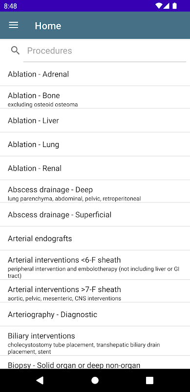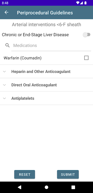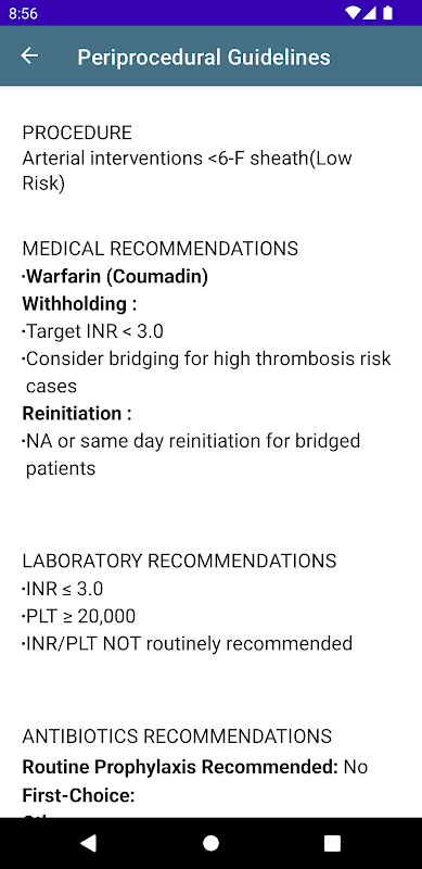प्रारंभिक रिलीज में एक इंटरैक्टिव पेरिप्रोसेड्यूरल सिफारिश कैलकुलेटर शामिल है जो एसआईआर सर्वसम्मति दिशानिर्देशों के आधार पर परिदृश्य-विशिष्ट एंटीकोआग्यूलेशन और एंटीबायोटिक सिफारिशें उत्पन्न करता है। उपयोगकर्ता रोगी और प्रक्रियात्मक रक्तस्राव जोखिम के अनुरूप सिफारिशें उत्पन्न करने के लिए दवाओं और रोगी कारकों को इनपुट कर सकते हैं। नैदानिक निर्णय लेने में सहायता के लिए नए नैदानिक अभ्यास दिशानिर्देश (सीपीजी) और उपकरणों को शामिल करने के लिए ऐप को लगातार अपडेट किया जाएगा।