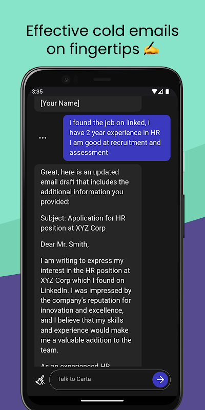 मास्टर ईमेल 📧 : कार्टा की ईमेल विजार्ड्री के साथ एक पेशेवर की तरह संवाद करें। चाहे धन्यवाद नोट हो या पेशेवर फॉलो-अप, यह आपको सही शब्द खोजने में मदद करता है, आपकी टोन को पॉलिश करता है, और एक स्थायी छाप छोड़ने वाले प्रभावशाली ईमेल भेजता है। ईमेल चिंता को अलविदा कहें और आत्मविश्वास से भरे पत्राचार को नमस्ते कहें!