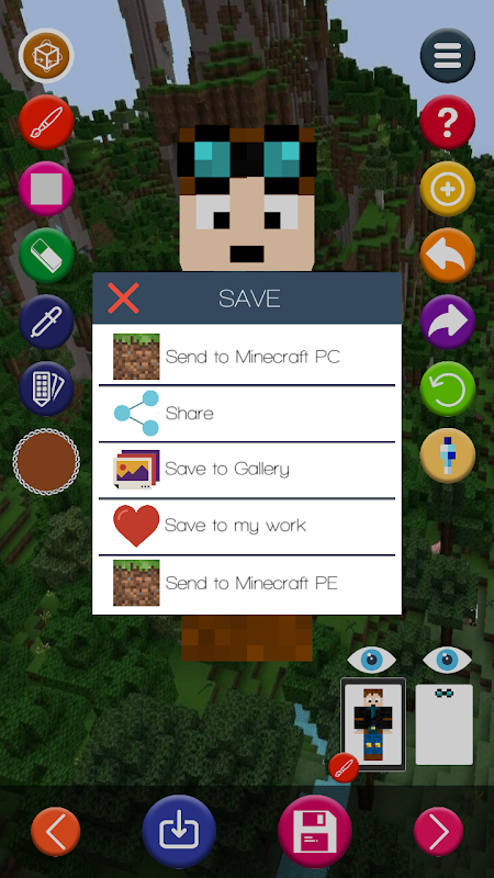 Use advanced tools like brush, paint bucket, eraser and color picker to edit your skin and create just the look you've been searching for! “Skin Editor 3D for Minecraft” has an easy to use skin part visibility chooser to let you focus just on the parts you want to edit.