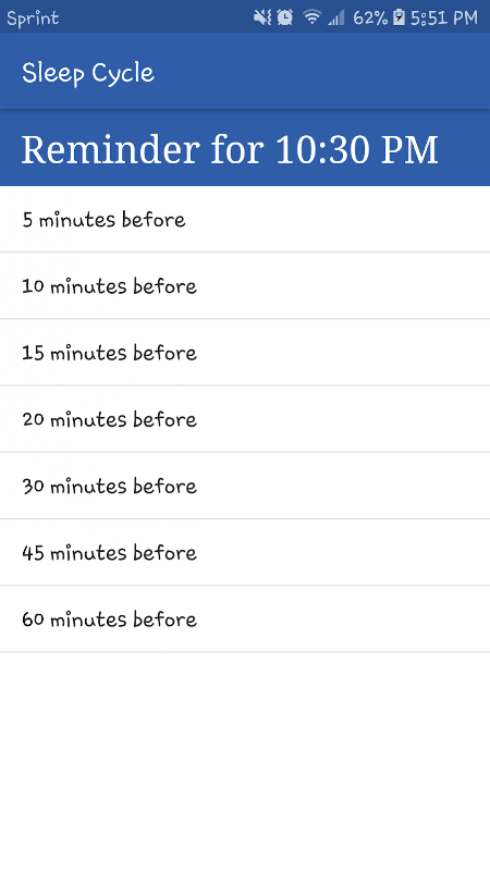उदाहरण 1: मैं अब सोना चाहता हूँ और लगभग 2 घंटे में उठता हूँ। अब रात के १०:१५ बज रहे हैं और यह मुझे लगभग ले जाता है। 10 मिनट सो जाने के लिए। यह ऐप सोते समय आपकी मात्रा को ध्यान में रखेगा, कारक हालांकि कई नींद चक्र 2 घंटे में होते हैं और उस समय को प्रस्तुत करते हैं जब आपका अलार्म आपको जगा देगा। आपके द्वारा देखी जाने वाली सूची पूर्व-गणना चक्र हैं।