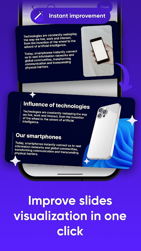प्रेजेंटेशन मेकर ऐप में AI प्रेजेंटेशन जेनरेटर, मोबाइल-फ्रेंडली एडिटर है जो आपको आसानी से प्रेजेंटेशन एडिट और क्रिएट करने की सुविधा देता है। स्मार्ट सेटिंग्स के साथ कुछ ही क्लिक में अपनी प्रेजेंटेशन की स्टाइल और डिज़ाइन बदलें। अब आपको अपनी उंगलियों से कंटेंट को मैन्युअल रूप से रखने की ज़रूरत नहीं है, हमारा एडिटर इसका ध्यान रखेगा।
