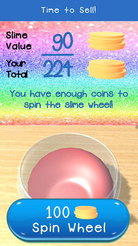 After you've made your slime, you can sell it for coins - try different ingredients to see what sells for the most! Once you get 100 coins you can spin the slime wheel to unlock more dyes and glitter!