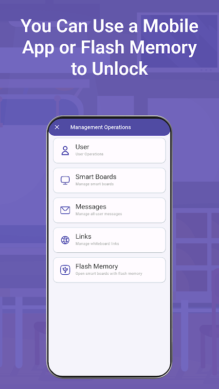 स्कूलों के लिए स्मार्ट बोर्ड दूरस्थ प्रबंधन अनुप्रयोग। आप अपने विद्यालय में स्थापित विंडोज 10 या उच्चतर ऑपरेटिंग सिस्टम वाले स्मार्ट बोर्ड पर लॉक एप्लिकेशन इंस्टॉल करके छात्रों द्वारा स्मार्ट बोर्ड के अनधिकृत और अनियंत्रित उपयोग को रोक सकते हैं। स्मार्ट बोर्ड के लॉक प्रोग्राम को शिक्षकों द्वारा मोबाइल एप्लिकेशन के माध्यम से नियंत्रित किया जा सकता है। जब आप स्मार्ट बोर्ड पर लॉक प्रोग्राम इंस्टॉल करते हैं, तो स्मार्ट बोर्ड स्क्रीन पर एक क्यूआर कोड दिखाई देगा। जब आप इस क्यूआर कोड को स्मार्ट बोर्ड एप्लिकेशन से स्कैन करेंगे तो स्मार्ट बोर्ड अपने आप आपके स्कूल से कनेक्ट हो जाएगा। जो शिक्षक स्मार्ट बोर्ड को अनलॉक करना चाहते हैं वे स्मार्ट बोर्ड एप्लिकेशन का उपयोग कर सकते हैं। आप स्मार्ट बोर्ड पर क्लिक करके और समय निर्धारित करके स्मार्ट बोर्ड को दूरस्थ रूप से चालू कर सकते हैं। समय समाप्त होने पर स्मार्ट बोर्ड स्वचालित रूप से लॉक हो जाएगा। आप चाहें तो स्मार्ट बोर्ड एप्लीकेशन के जरिए भी स्मार्ट बोर्ड को लॉक कर सकते हैं।