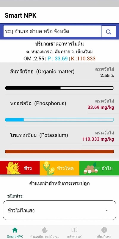 यह आवेदन थाईलैंड की मिट्टी की गुणवत्ता प्रदान की है और किसानों को चावल, मक्का, और longan के लिए उर्वरक की जानकारी प्रदान की। अब हम उत्तरी थाईलैंड में केवल 9 प्रांतों का समर्थन