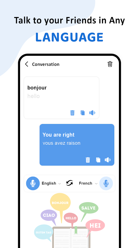 स्मार्ट ट्रांसलेशन ऑल लैंग्वेज, वॉयस टेक्स्ट ट्रांसलेटर भाषा रूपांतरण और अनुवाद के लिए बहुत अच्छा है। एक छोटा शब्द अनुवादक ऐप विश्व भाषाओं का पैकेज प्रदान करता है। निःशुल्क वॉयस ट्रांसलेटर ऐप का उपयोग करके 80 से अधिक भाषाओं में भाषण और अनुवाद। यह एक मुफ्त विदेशी भाषा अनुवादक एप्लिकेशन है जो आपको विदेशियों के साथ उनकी मूल भाषा में संवाद करने में मदद करेगा।