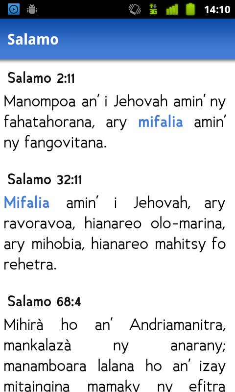 - Concordance : recherchez une expression dans la Bible ou dans le Fihirana (à venir)
