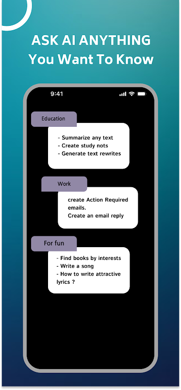 प्रोग्रामिंग कोड तैयार करने, आहार योजनाएं बनाने, व्यंजन ढूंढने, नए कौशल सीखने, जन्मदिन संदेश/व्यावसायिक ईमेल लिखने, गाने के बोल लिखने, नौकरी के लिए साक्षात्कार की तैयारी करने, यहां तक कि किसी भी भाषा में पाठ का अनुवाद करने आदि में सहायता प्राप्त करें - इसकी सहायता से स्मार्ट चैट-एआई चैटबॉट असिस्टेंट आपकी आवश्यकताओं के अनुरूप बनाया गया है।