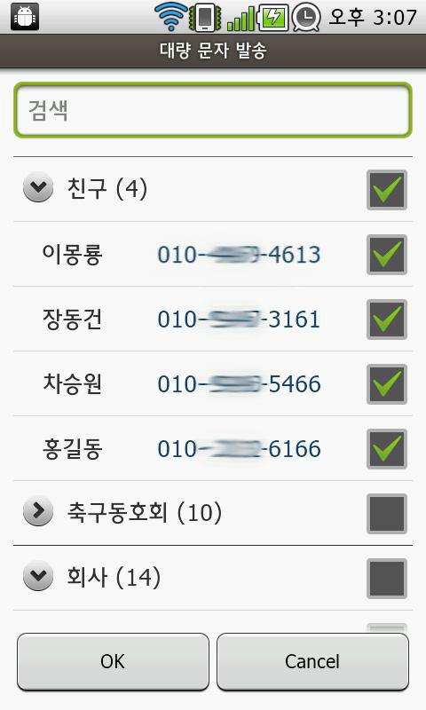 폰의 주소록에 등록한 그룹을 그대로 사용하기 때문에 발송 대상을 따로 등록하거나 별도의 그룹관리가 필요 없으며, 그룹 내에서 특정 발송대상을 선택하거나 제외할 수도 있어 편리합니다.