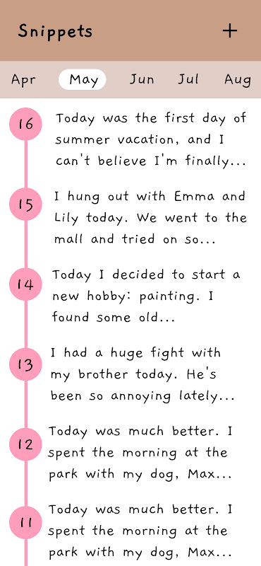 लिखने की आदत बनाए रखें: स्निपेट्स उन लोगों के लिए एकदम सही है जो लिखने की आदत बनाना या बनाए रखना चाहते हैं। हमारे उपयोगकर्ता-अनुकूल डिज़ाइन के साथ, आपके लिए अपने विचारों को नियमित रूप से लिखना पहले से कहीं अधिक आसान हो जाएगा।