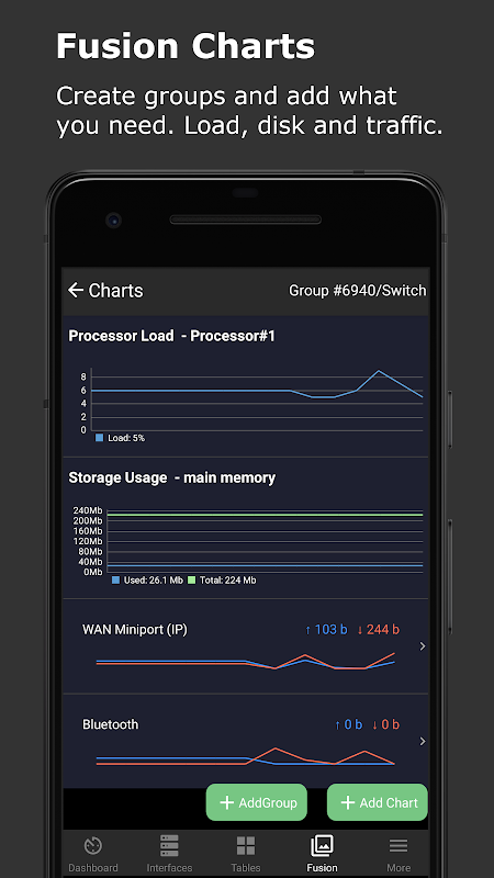 • ट्रैफिक मॉनिटरिंग। सांख्यिकी इंटरफ़ेस प्रकार, ग्रिड और पाई चार्ट दिखाएं। लाइव इंटरफ़ेस दर सूची, अंतिम tx / rx और मिनी लाइन चार्ट दिखाएं। भ्रूण अंतराल 3 सेकंड है। लाइव इंटरफ़ेस डिटेल व्यू, शो tx / rx लास्ट, मैक्सिमम एंड एवरेज और लार्ज लाइन चार्ट।