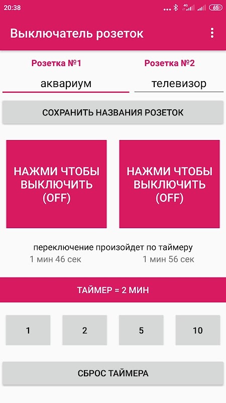 Программа предназначена для управления двумя розетками. А точнее: подача 220 вольт к ним через реле. Применение найти можно самое разнообразное: от включения телевизора, освещения аквариума, света в комнате, открытие ворот в гараже, поднятие шлагбаума, скрытый замок, сигнализация и т.д. Короче все то, что хотелось бы включить дистанционно на расстоянии 10-15 метров, т.е. в зоне действия блютуз. В инструкции есть описание как собрать исполнительное устройство на микроконтроллере Arduino.