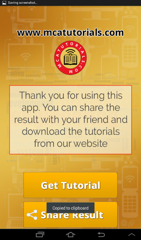 सत्र के अंत में, यह एक पाई ग्राफ के साथ परिणाम प्रदर्शित करता है। आप अपने दोस्तों के साथ इस परिणाम को साझा कर सकते हैं। आप इस विषय के बारे में अधिक जानकारी चाहते हैं, अनुप्रयोग भी मुक्त करने के लिए ट्यूटोरियल है। यह एक व्यापक उपकरण है कि आप सॉफ्टवेयर इंजीनियरिंग परीक्षा के लिए तैयार करता है।