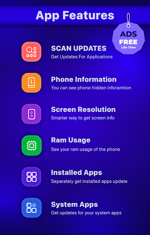 Besides apps updates features it also includes other features which will help you the most about your phone, like it includes all the phone's hidden information like storage information, phone model, android version, camera information, battery information, CPU information, RAM information, Phone Name and many More.