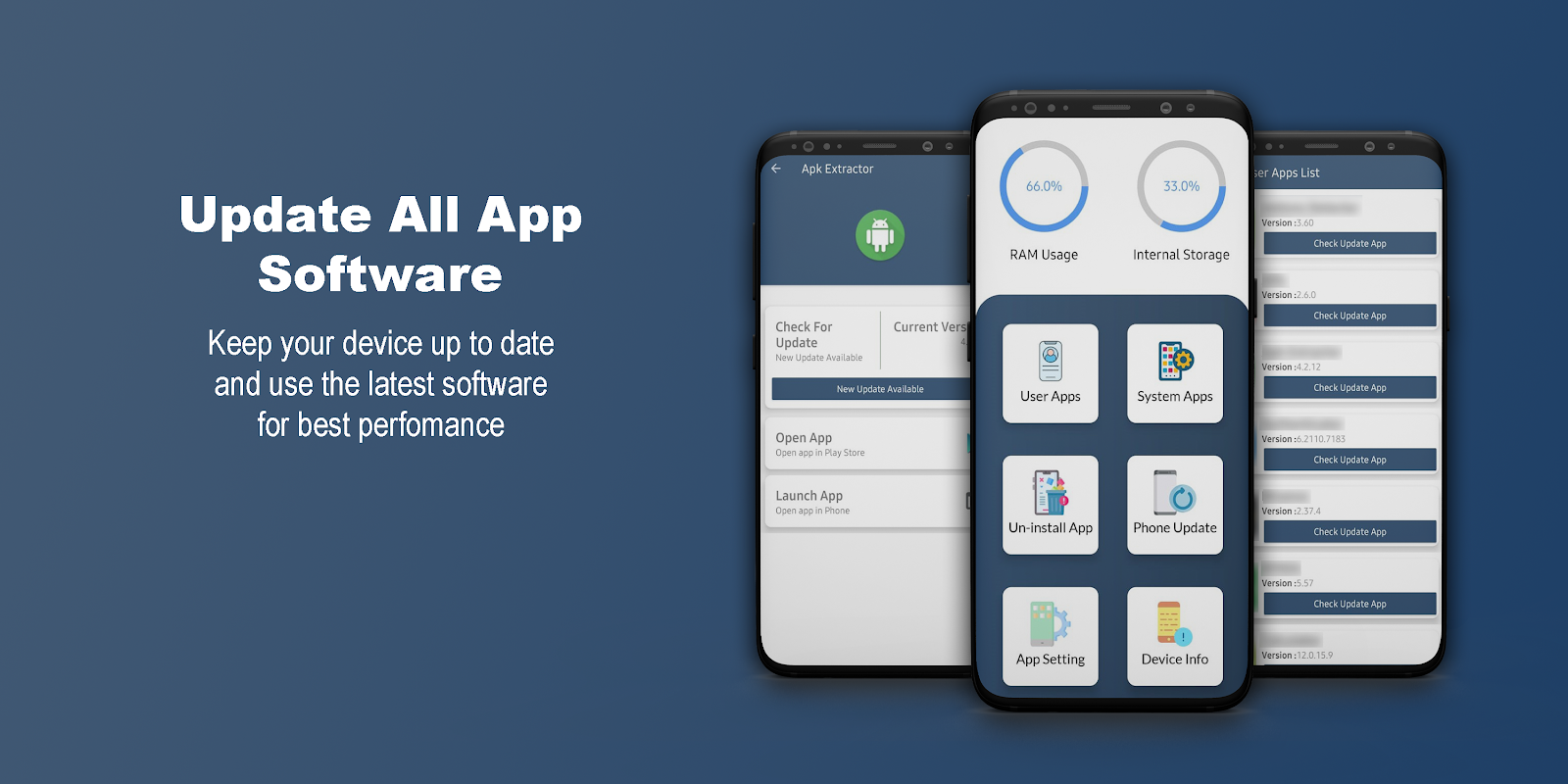 आपके लिए ऐप अपडेट ऑल और गेम अपडेट चेकर जो आपके Android ऐप्स और OS सॉफ़्टवेयर को अपग्रेड करता है। अपडेटेड सॉफ़्टवेयर आपके स्मार्ट फ़ोन के लिए उपलब्ध नवीनतम या हाल के अपडेट की जाँच करता है और आपको एक अलर्ट सूचना भेजता है। एक टैप से यह सॉफ्टवेयर नवीनतम एंड्रॉइड फोन के लिए सभी ऐप्स को अपडेट करता है। सेवा अद्यतन और नया संस्करण सॉफ़्टवेयर स्थापना। ऐप अपडेट लिस्ट और ऑल ऐप अपडेट चेकर एक डिजिटल अपग्रेडेड वर्जन डिटेक्टर टूल है
