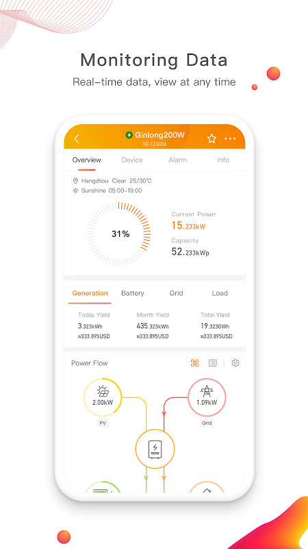 1. पीवी प्लांट का रीयल-टाइम डेटा देखें, और किसी भी समय और कहीं भी उपकरण की स्थिति को नियंत्रित करें।