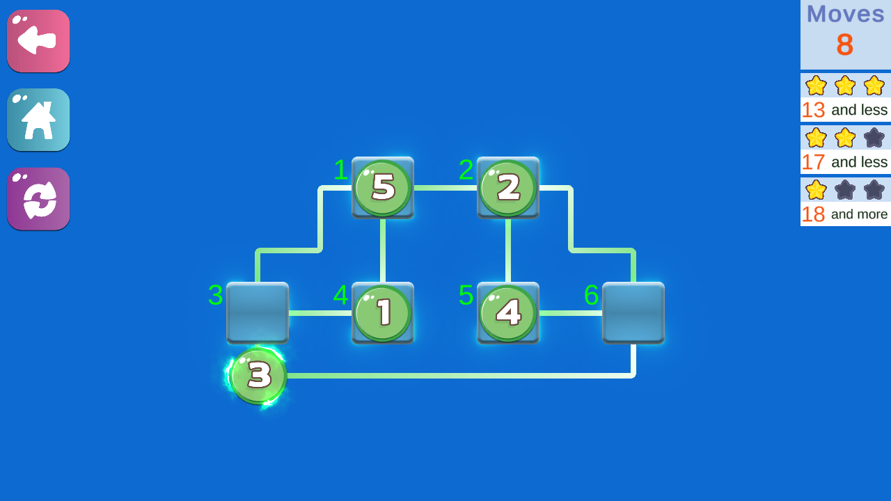 मैदान पर, संख्याओं वाली आकृतियाँ उनके कक्षों में नहीं रखी जाती हैं। आपको संख्याओं वाली आकृतियों को इस तरह से हिलाना होगा कि प्रत्येक आकृति अपने नंबर वाली कक्ष में चली जाए। एक मूर्ति को केवल उस खाली कक्ष में ले जाया जा सकता है जो मूर्ति के कक्ष से जुड़ा हो। जीतने के लिए - सभी आकृतियों को उनके कक्षों में व्यवस्थित करें।