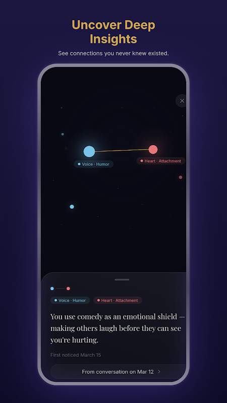 एक व्यक्तिगत रात्रि आकाश जो पूरी तरह से आपका है। जैसे-जैसे आप अपने बारे में अधिक जानते हैं, तारे गतिमान होते हैं, चमकते हैं और जुड़ते हैं। किसी भी तारे पर टैप करके देखें कि वह कब अस्तित्व में आया — और उसका क्या अर्थ है।