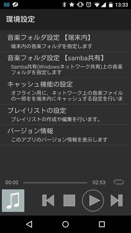 なお、ネットワークが切断されている等の理由でsamba共有上の音楽ファイルが参照できない場合、端末内に音楽ファイルがあれば、端末内の音楽ファイルをシャッフル再生します。