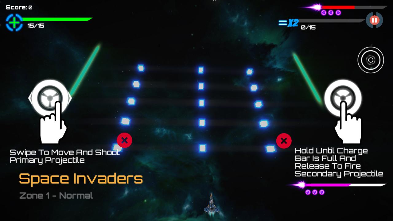 * Left touch button to move spaceship horizontally and fire primary weapons.