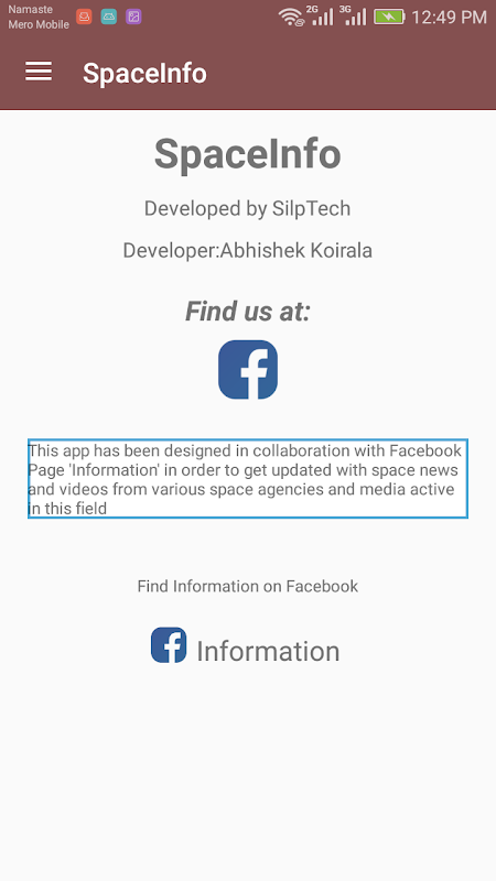 This app has been built in collaboration with Facebook page "Information". It targets in sharing news and videos from various space agencies and related medias. Get news and videos in an organized way. No ads.