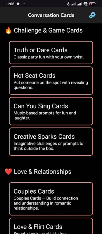 विविध श्रेणियाँ: आइसब्रेकर, रैंडम, पहेलियाँ, यह या वह, क्या आप जानते हैं, वार्तालाप आरंभकर्ता, कहानी समय, अलोकप्रिय राय, डीप टॉक, ट्रुथ या डेयर, हॉट सीट, क्या आप गा सकते हैं, क्रिएटिव स्पार्क्स, कपल्स, लव एंड फ़्लर्ट, और सेल्फ़-रिफ़्लेक्शन कार्ड सहित विभिन्न थीम पर सैकड़ों अद्वितीय संकेतों का अन्वेषण करें।