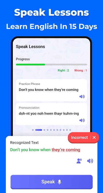 बोलें पाठ अनुभाग में, उपयोगकर्ता व्यावहारिक बोलने के अभ्यास में संलग्न होते हैं जो तीन स्तरों में विभाजित होते हैं: शुरुआती, मध्यवर्ती और उन्नत। प्रत्येक अभ्यास दो कुंजी बटनों के साथ वाक्यांश प्रस्तुत करता है: "सुनें" और "अभ्यास करें।" पहले, उपयोगकर्ता सही उच्चारण सुनते हैं, फिर वे वाक्यांश बोलकर अभ्यास करते हैं। अत्याधुनिक वाक् पहचान तकनीक का उपयोग करते हुए, ऐप आपके भाषण का विश्लेषण करता है और तुरंत आपको बताता है कि यह सही है या गलत। यह यह भी ट्रैक करता है कि आपने कितने प्रयास किए, और आपकी प्रगति पर विस्तृत प्रतिक्रिया प्रदान करता है। इसके अतिरिक्त, उपयोगकर्ता प्रयासों को संपादित या हटा सकते हैं, अपने स्वयं के कस्टम अभ्यास बना सकते हैं और यहां तक कि अपनी सीखने की यात्रा को निजीकृत करने के लिए नए कदम भी जोड़ सकते हैं। अंग्रेजी भाषा सीखें, प्रवाह और आत्मविश्वास विकसित करने के लिए व्यावहारिक दृष्टिकोण प्रदान करके बोलने के अभ्यास को अगले स्तर तक ले जाता है।