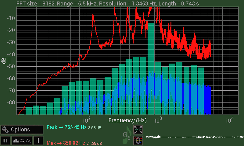 म्यूजिकल नोट इंडिकेटर (हरा अगर 5 सेंट के भीतर, नारंगी अगर 10 सेंट के भीतर)।