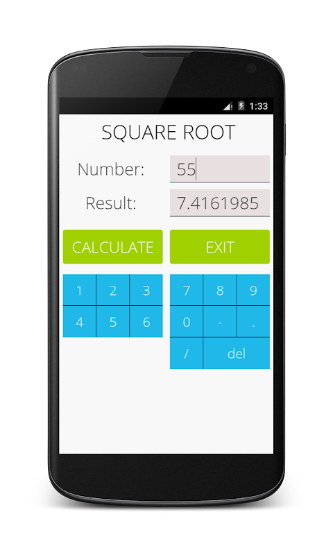 यह मुफ्त app एक संख्या का वर्गमूल गणना करने में सक्षम है. पूर्णांक संख्या, दशमलव संख्या और भिन्न समर्थन कर रहे हैं.