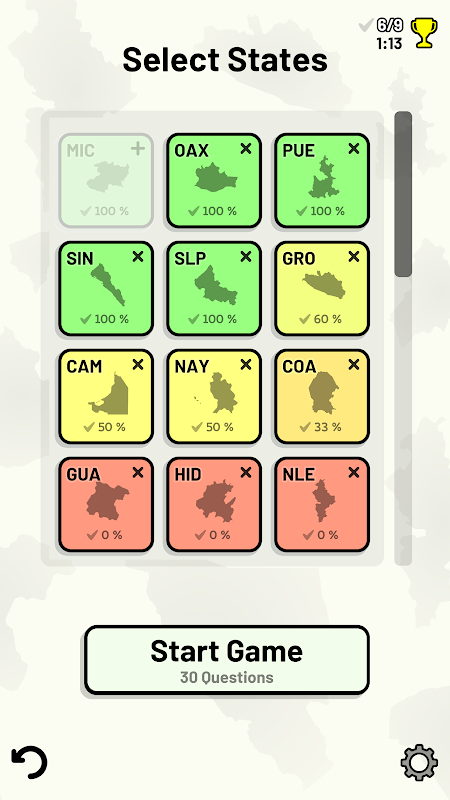 अनुकूलन योग्य क्विज़ आपको यह चुनने की अनुमति देते हैं कि किन राज्यों का परीक्षण करना है, साथ ही विषय भी। प्रत्येक राज्य के पिछले परिणाम प्रत्येक विषय पर आपकी प्रगति को उजागर करने के लिए प्रदर्शित किए जाते हैं।