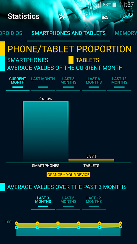 सांख्यिकी और सांख्यिकी प्रो प्रदान अप-टू-डेट और Android स्मार्टफ़ोन और टेबलेट के लिए पिछले 12 महीनों के वैश्विक सांख्यिकीय आंकड़ों, हमेशा अपने डिवाइस की तुलना में।