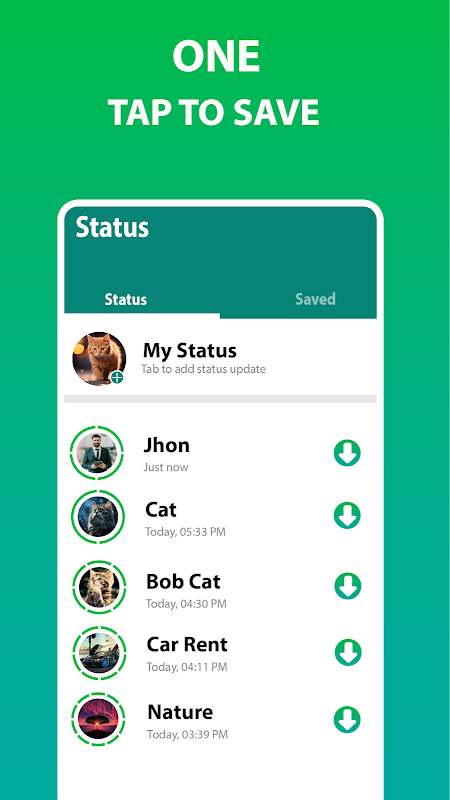स्टेटस वीडियो ऐप से अपने सभी दोस्तों के स्टेटस आसानी से डाउनलोड करें, चाहे वह वीडियो, छवि या ऑडियो स्टेटस हो। अब मित्रों से उनके स्टेटस साझा करने के लिए नहीं कहा जाएगा-बस एक क्लिक में सीधे अपनी गैलरी में डाउनलोड करें।