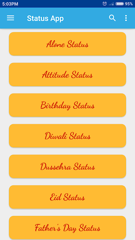 This app provides you with the best collection of status messages and quotes. Never miss out on any occasion as we bring you an app with a variety of messages in various categories. No need to waste time searching for the right caption, we have got the best of the lot. The app includes status for all categories including festivals, love, birthdays, anniversaries, friendships, inspiration, patriotism, and a lot more. So you are just a step away from sharing these messages with your peers. CHEERS!!