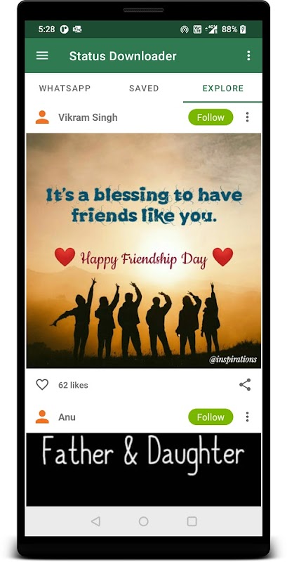 दोस्तों के साथ साझा करें: उपयोगकर्ता व्हाट्सएप, इंस्टाग्राम, फेसबुक और अन्य जैसे सोशल मीडिया प्लेटफॉर्म के माध्यम से अपने दोस्तों और परिवार के साथ डाउनलोड की गई स्थिति साझा कर सकते हैं।