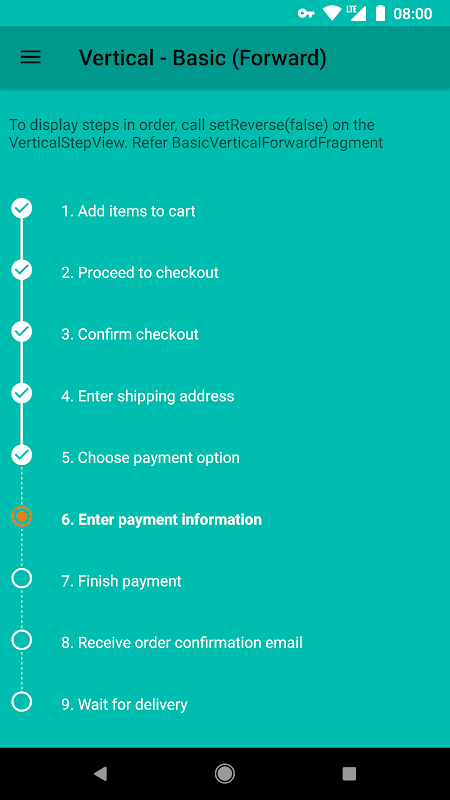 Demo of customizable View for a step-by-step process (order checkout, app first launch, intro, timeline visualization). The StepView displays the name of the step and an icon associated with the state of the step (completed, currently active, not completed).