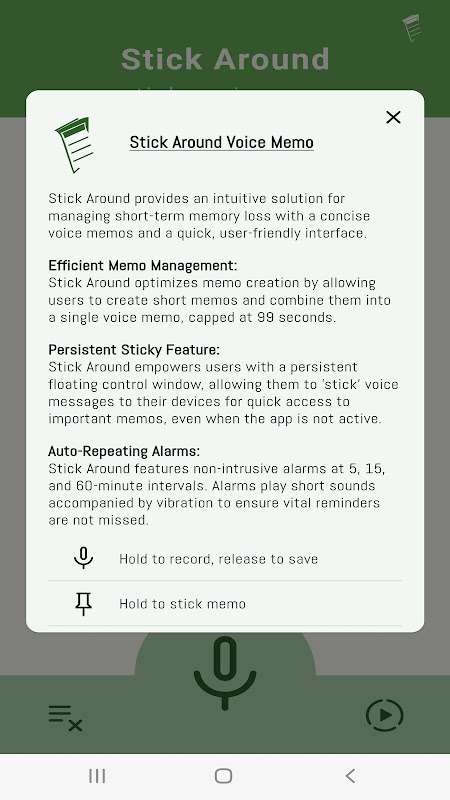 स्टिक अराउंड उपयोगकर्ताओं को लगातार फ्लोटिंग कंट्रोल विंडो के साथ सशक्त बनाता है, जिससे उन्हें महत्वपूर्ण मेमो तक त्वरित पहुंच के लिए अपने डिवाइस पर ध्वनि संदेशों को 'स्टिक' करने की अनुमति मिलती है, भले ही ऐप सक्रिय न हो।