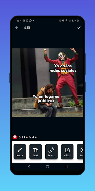 - Puedes usar fotos o memes directamente de tu galería. Así de sencillo, edita tus fotos y exporta rápidamente a WhatsApp.