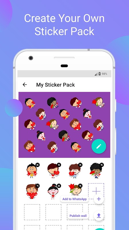 Install and Tap on create own sticker button in the main screen. Choose sticker pack or videos story. If you want to make sticker pack and give the best name and select 3 - 30 images from storage and store it in WASticker and add to WhatsApp or publish. If you choose songs status then give the best name, description, category, artist, language, and video and publish.