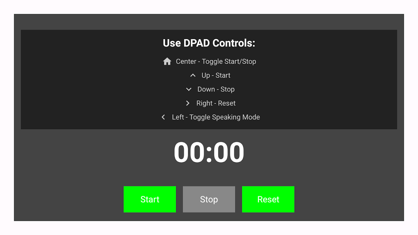 डीपीएडी नियंत्रण, बोलने का तरीका और ध्वनि प्रभाव के साथ एक सरल स्टॉपवॉच ऐप