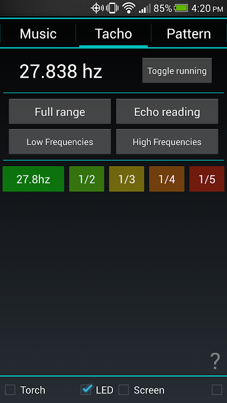नया ऑडियो टैकोमीटर फीचर आपके फोन को एक दोहराई जाने वाली ध्वनि सुनने और मौलिक आवृत्ति और किसी भी हार्मोनिक्स की खोज करने की अनुमति देता है। फिर एक साधारण बटन प्रेस के साथ, आप उस आवृत्ति पर एलईडी फ्लैश कर सकते हैं और सब कुछ फ्रीज देख सकते हैं।