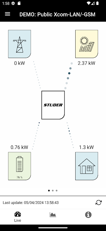 जब इंस्टालेशन xtender रेंज के लिए xcom LAN/GSM या अगली रेंज के लिए nx इंटरफ़ेस का उपयोग करके कनेक्ट होता है, तो स्टडर आसान मॉनिटरिंग ऐप आपके स्टडर एनर्जी सिस्टम की सभी जानकारी प्रदर्शित करता है।
