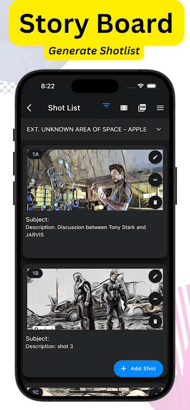 प्रोडक्शन से पहले हर सीन को विजुअलाइज़ करने के लिए प्रोफेशनल शॉट लिस्ट बनाएं और एआई स्टोरीबोर्ड तैयार करें। बेहतर सीन प्लानिंग के लिए कैमरा शॉट्स व्यवस्थित करें।