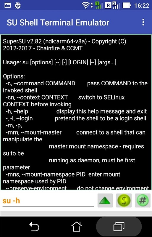 first button with $ symbol : you can run all Linux commands and save results to text file and return to the history to reduce writing , just click on the list-view of your history for run commands again .