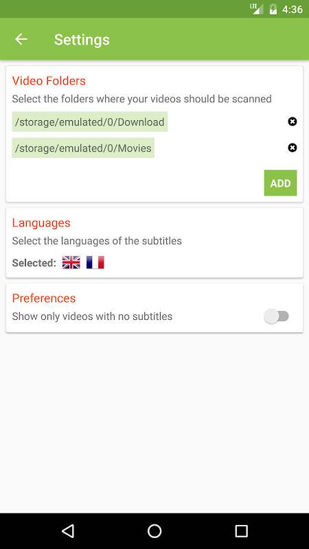 This application scans your phone for video files and allows you to search and download subtitles for any selected video.