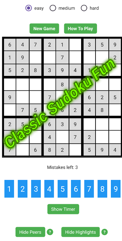 लाखों लोगों द्वारा पसंद की जाने वाली इस सदाबहार तर्क पहेली का आनंद लें. 3 कठिनाई स्तरों, रिट्रेसमेंट और एक सहज इंटरफ़ेस के साथ, हमारा सुडोकू गेम शुरुआती और अनुभवी खिलाड़ियों के लिए एकदम सही है. रोज़ाना खेलें और खुद को चुनौती दें!