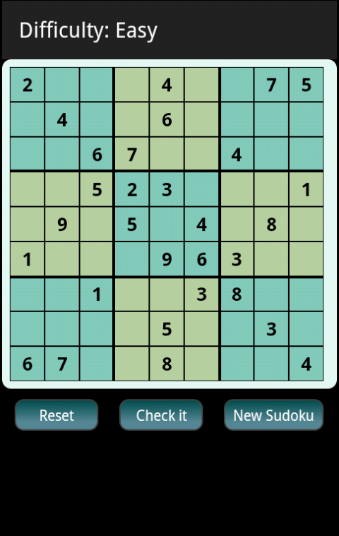 सुडोकू 3 कठिनाई स्तरों (आसान, मध्यम और कठिन) के साथ पहेलियाँ बनाता है, जो इसे हल करने के लिए आवश्यक सुडोकू रणनीतियों पर निर्भर करता है।