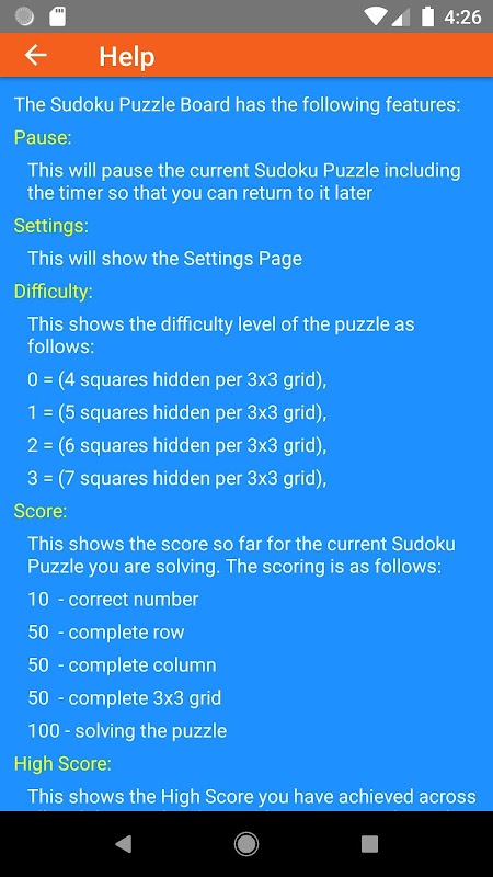It has several difficulty levels as well as a Hint feature to help you solve those tricky Sudoku puzzles. There is also a Notes feature to help you to find the missing numbers. Also included is an Undo feature to return the Sudoku puzzle to an earlier position. The Timer and difficulty levels can be changed in the Settings Page and the Game can be paused at any time. There is also a Help Page to assist you with using the Sudoku Puzzle App.